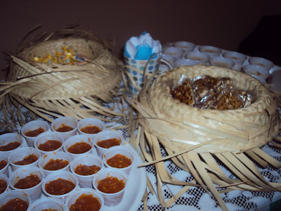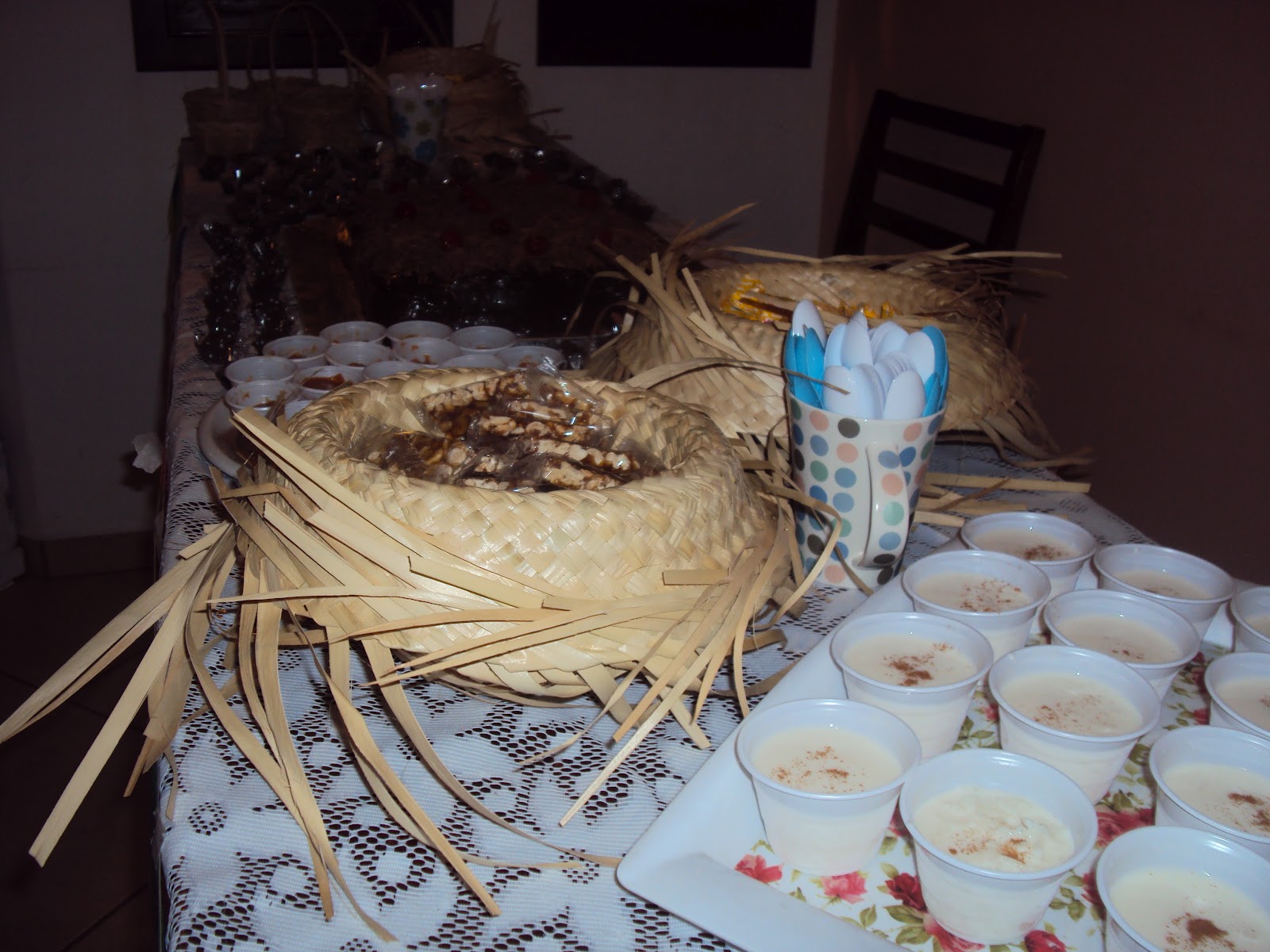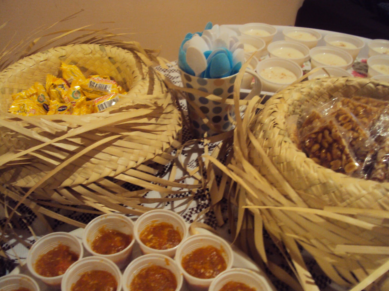 Usei os chapéus de palha para colocar os doces..teve muita paçoca, pé de moleque (feito por vózinha de maridú)..