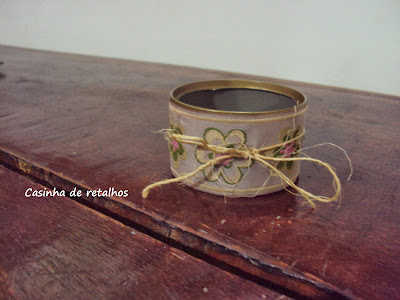 São necessários: um pedaço de fita decorada, barbante de sisal e a latinha